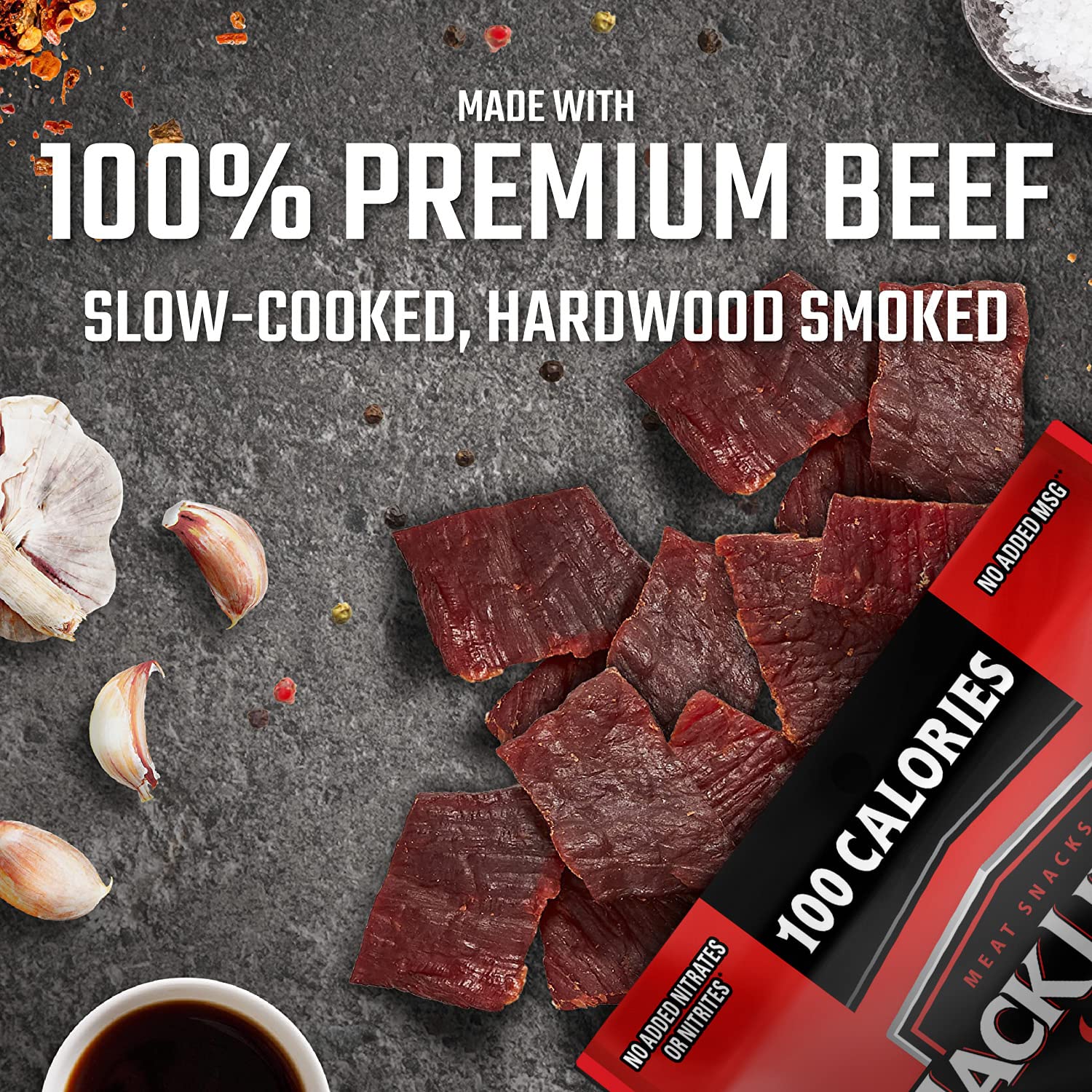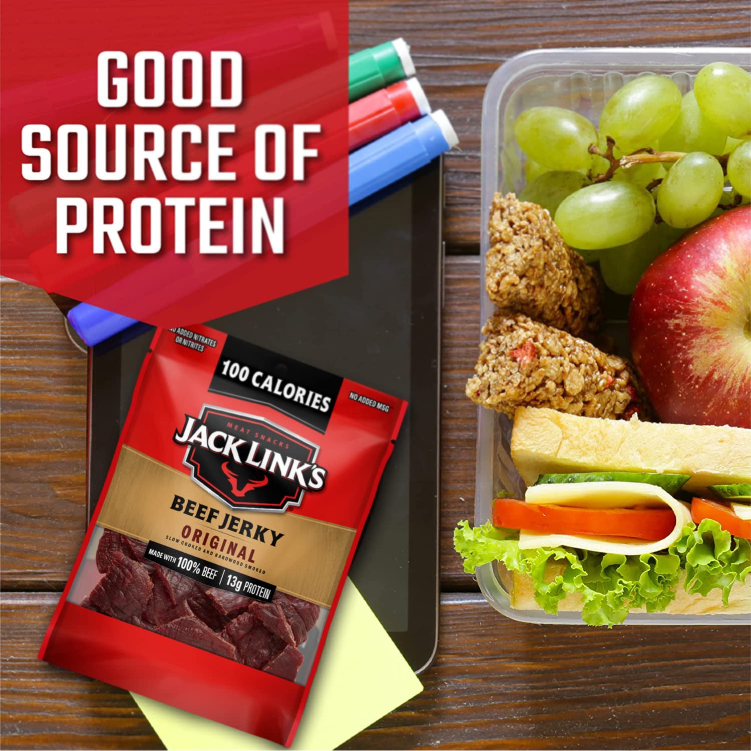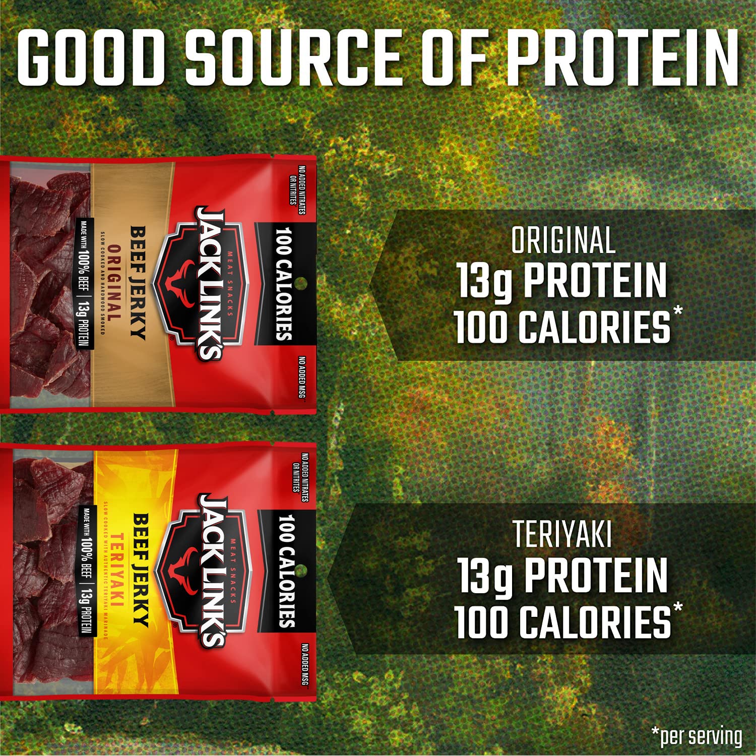 Plenty of protein in your diet is a key to staying energized and satisfied all day long, and it's never been easier to work protein into your diet than with the Jack Link's Beef Jerky Variety Pack. The single serve beef jerky bags are the perfect choice for on-the-go snacking when you're out running errands as well as for your family's lunch boxes – even the little ones! They're a great way to ensure you're getting enough protein each day. The variety pack also makes it easy to keep bags at home in the pantry, in your desk at work, your diaper bag or in the car, so you can grab a delicious, easy snack when hunger strikes. Each flavor of Jack Link's beef jerky is made from lean cuts of 100% premium beef, then seasoned with simple like salt, water and spices. Our delicious beef jerky is 94% fat free with no added MSG**. Jack Link's quality starts with the meat. We expertly season each piece and then slow cook over hardwood smoke. **Except for that naturally occurring in soy sauce, hydrolyzed corn protein, and yeast extract