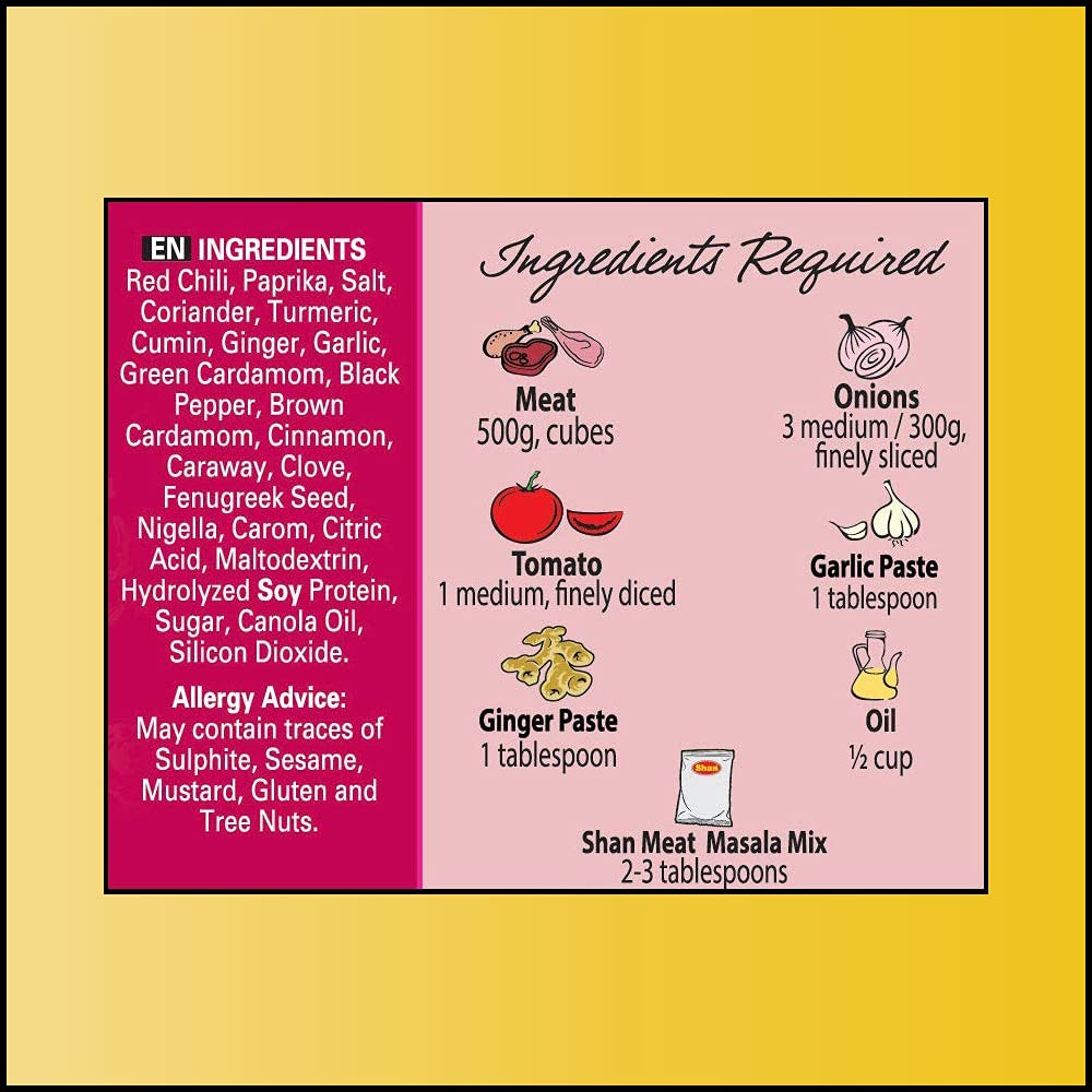 This easy to prepare Shan Meat Masala Mix is great for medium meat curry. Simply follow the recipe provided on the back of the box for a delicious meal that your whole family will enjoy! Recipe in Hindi and Bangla printed inside.